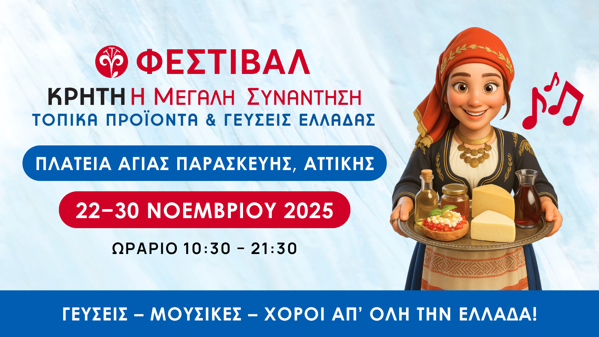 Το Φεστιβάλ «Κρήτη: Η Μεγάλη Συνάντηση-Τοπικά Προϊόντα και Γεύσεις Ελλάδας» καταφθάνει στην Αγία Παρασκευή Αττικής, από 22 έως και 30 Νοεμβρίου 2025. Εκεί, στην κεντρική πλατεία, σε μία απ’ τις ζωντανότερες περιοχές της Αττικής, στήνουμε παρέα τη μεγαλύτερη γαστρονομική και πολιτιστική συνάντηση της χώρας – μια μεγάλη γιορτή για μικρούς και μεγάλους γεμάτη από τη ζωντανή παράδοση και τις αυθεντικές γεύσεις που κάνουν τον τόπο μας να ξεχωρίζει!